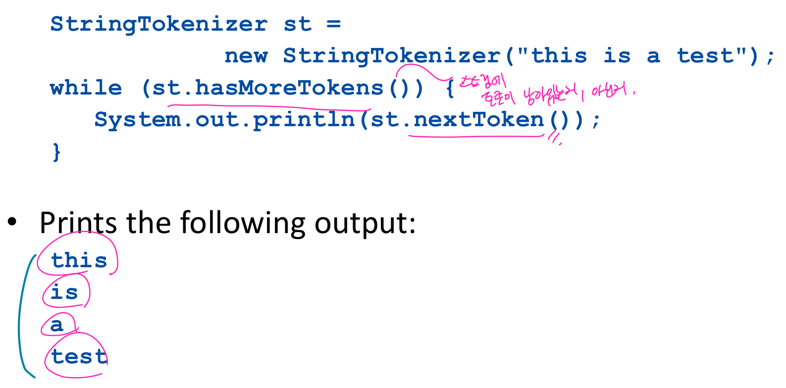 StringTokenizer Class = 주어진 스트링의 토큰을 하나하나씩 잘라내는 것