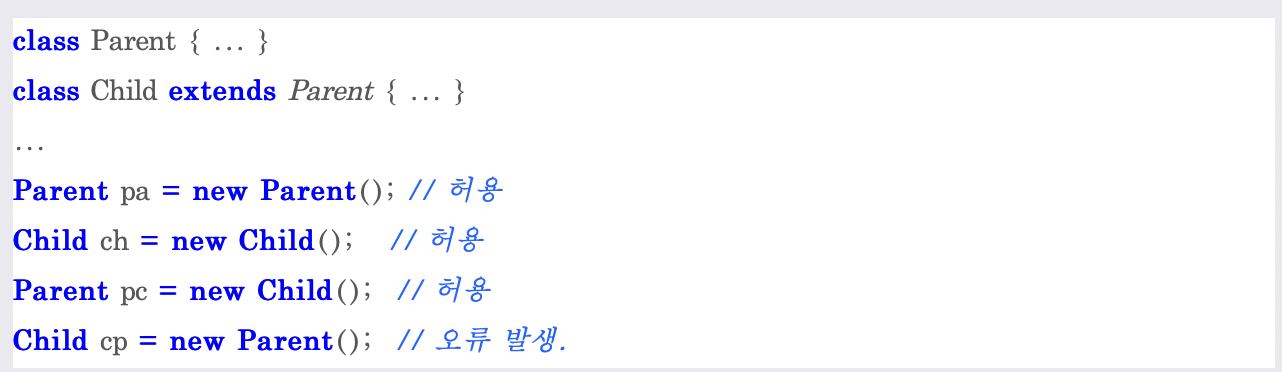 -> 부모 class type에 자식 클래스타입의 인스턴스 참조할 수 ㅇ !