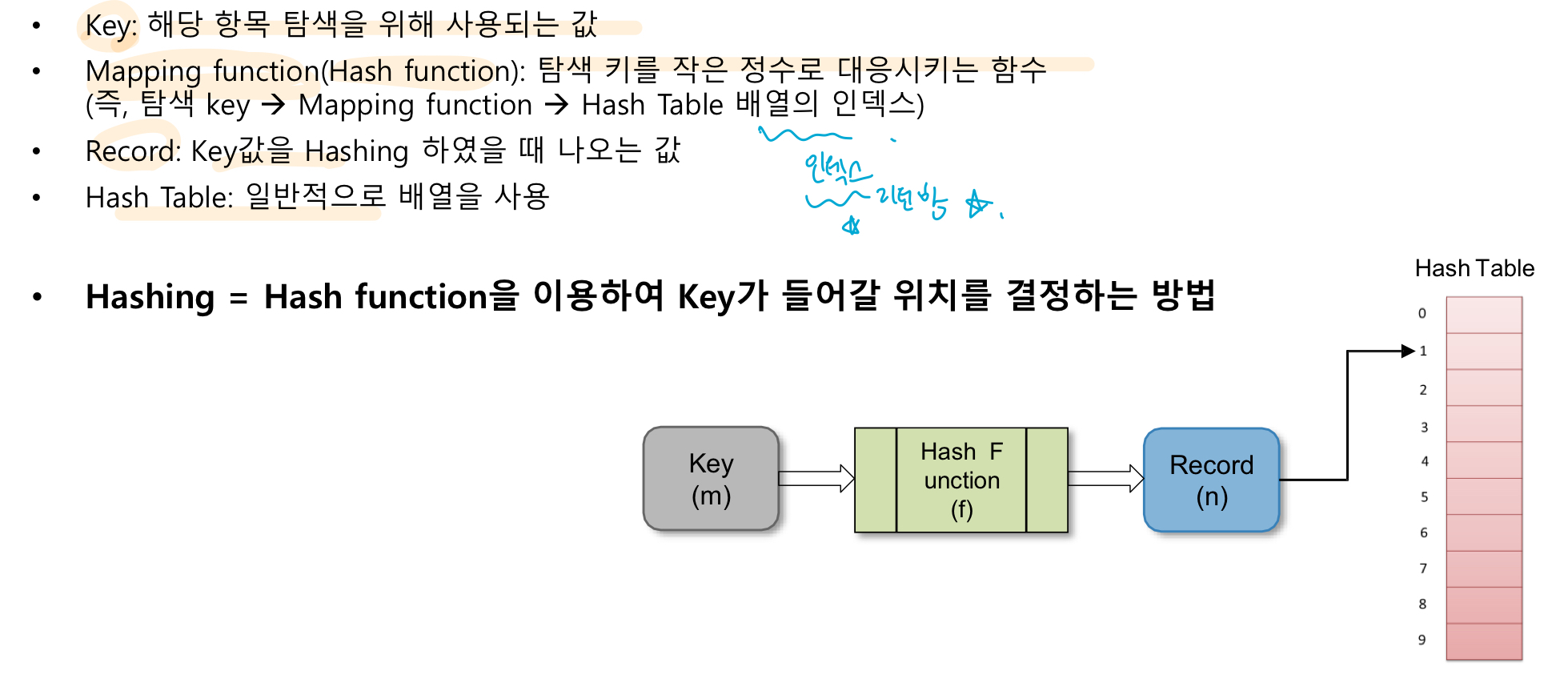 - hashing : 키값에 hash function을 적용하여 뭐여
