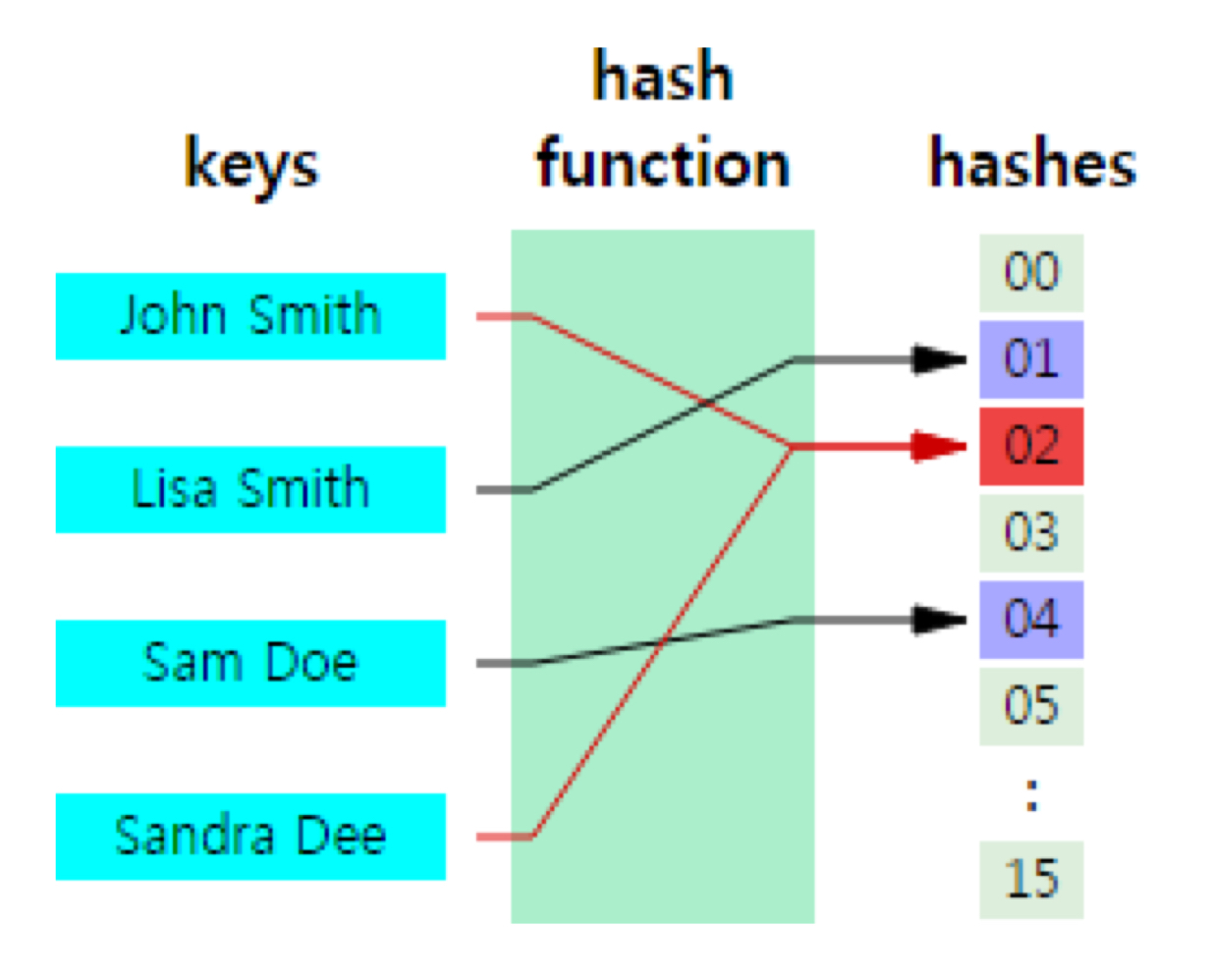 (= 서로 다른 key값 갖는 항목들이 같은 hashing 결과값(해시 주소) 갖게 되는 현상. 서로 다른 키가 하나의 주소에 mapping 되는 것)