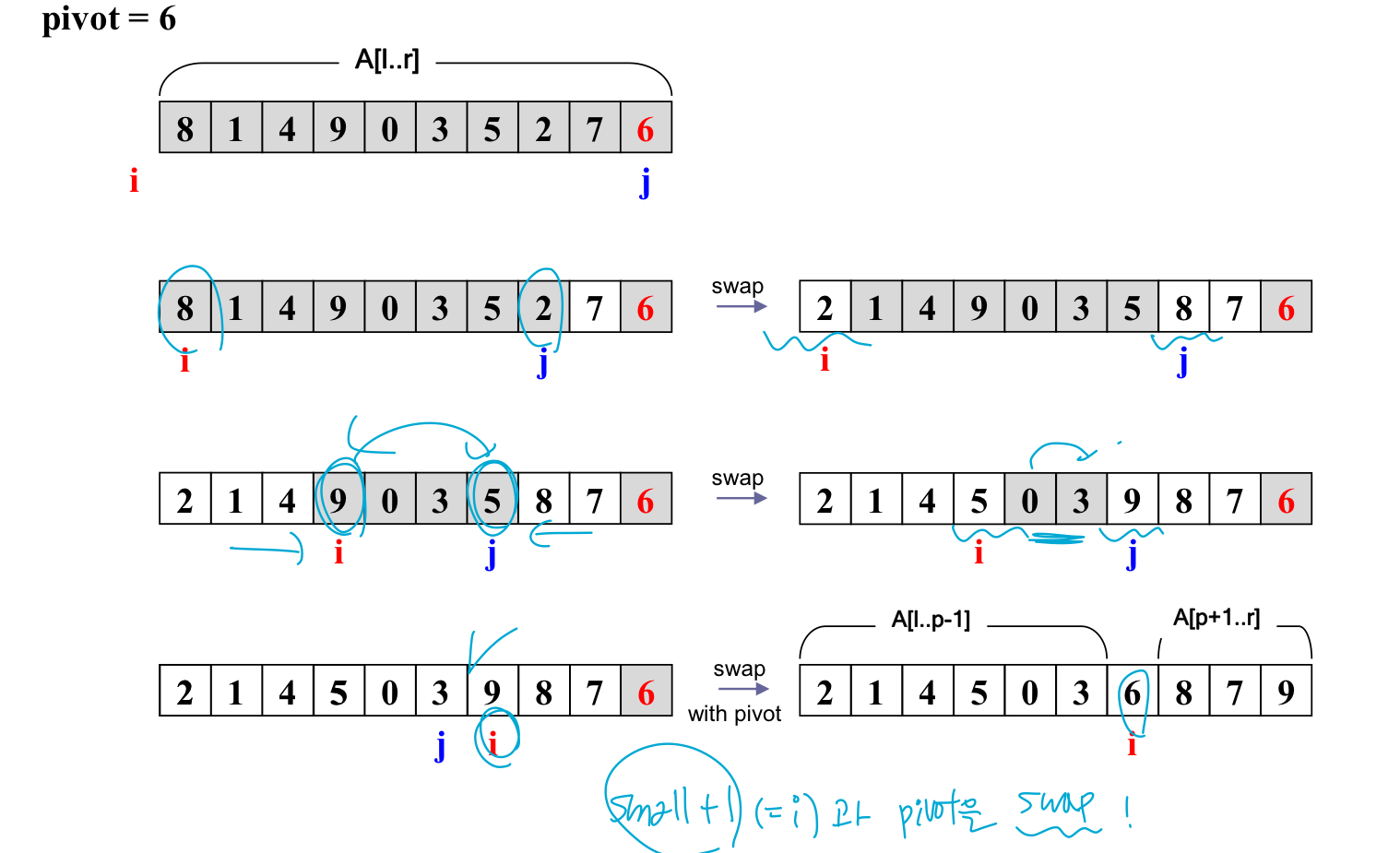 그리구 다햇으면 small+1과 pivot을 swap!