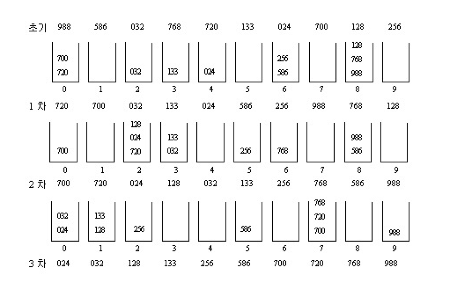 2. 점점 자릿수 올라가면서 비교해서 정렬 끗