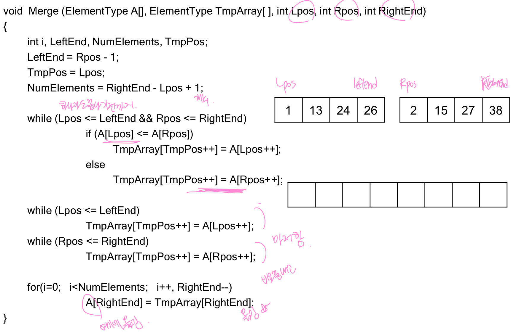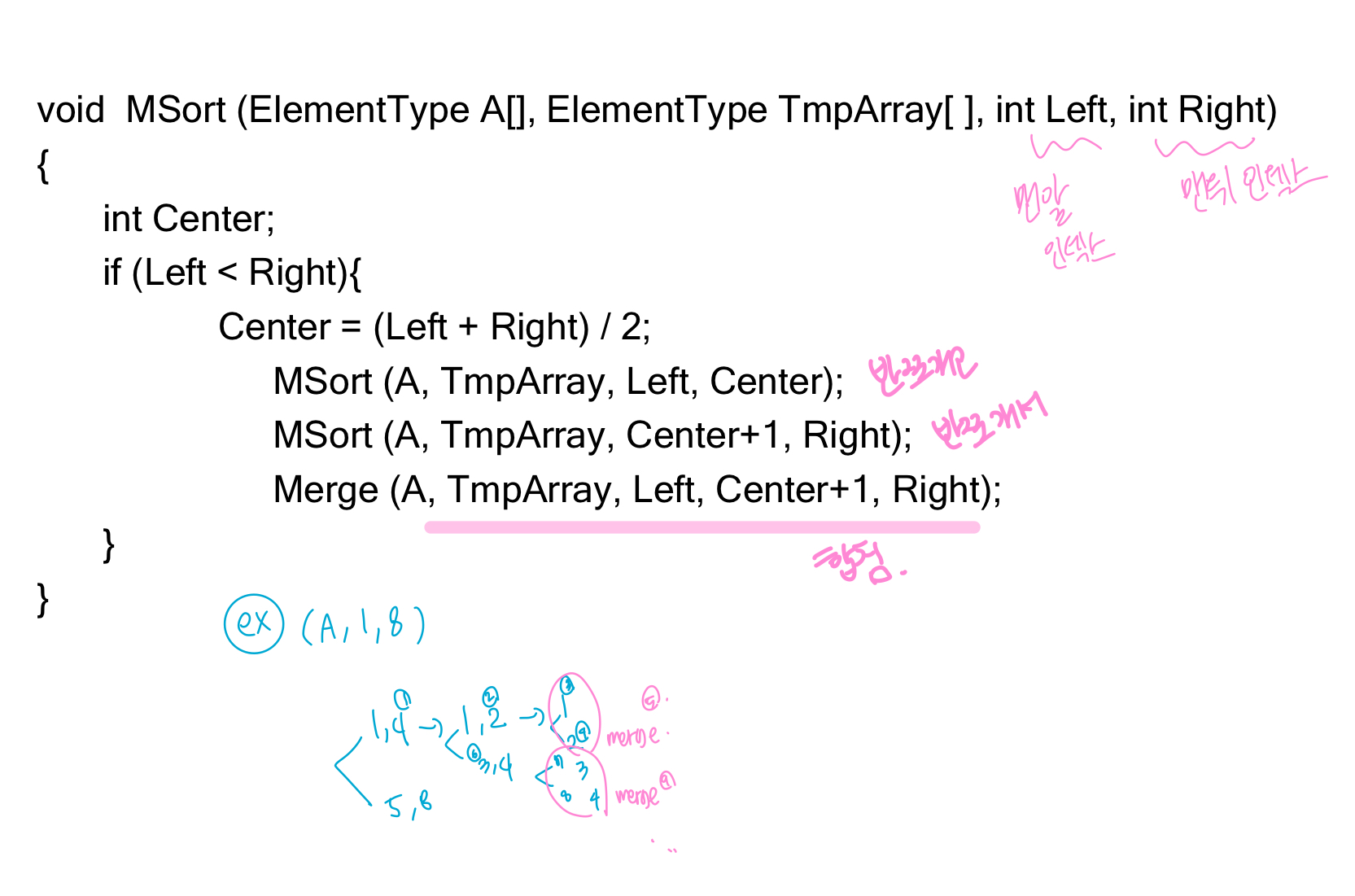 처음에는 sorted안되어있으니까 다 1개인걸로 쪼개놓으면 sorted니까 쪼개서 합치는 것!!